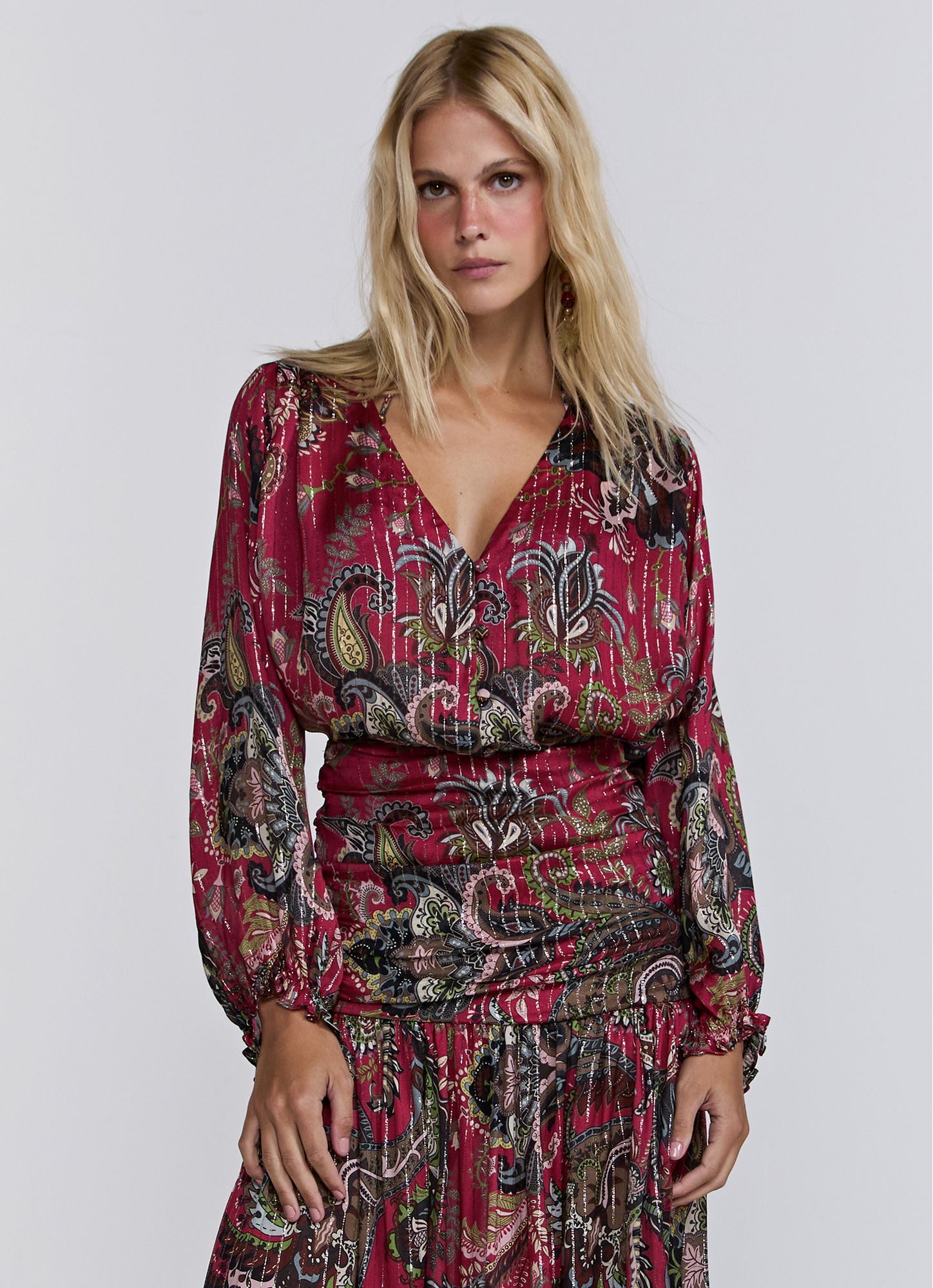 Viscose fabric blouse with exclusive digital cashmere lurex thread. Features a V-neck that flatters the décolletage, wide sleeves with a slight volume, and a loose fit for maximum comfort and elegance. A versatile piece, perfect for creating beach looks or urban outfits with a boho-chic touch. REF.: I26BL09VA Composition: 100% Viscose Model wears size S Made in Brazil Prints may vary slightly depending on the fabric cut.