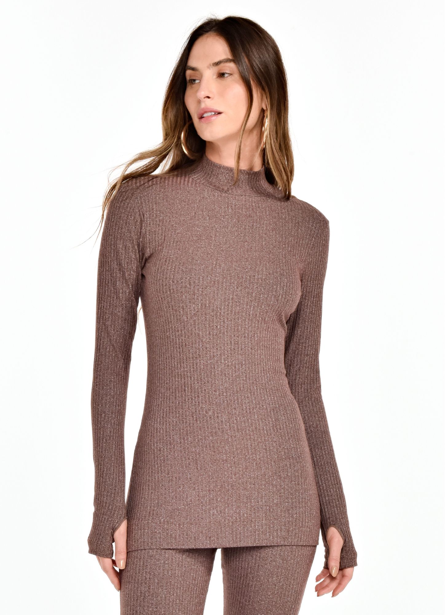 Long sleeve blouse with high collar, ribbed fabric. REF.: I25BL04VA Composition: 52% Viscose 43% Polyester 05% Elastane Model wears size PP Made in Brazil Wash gently