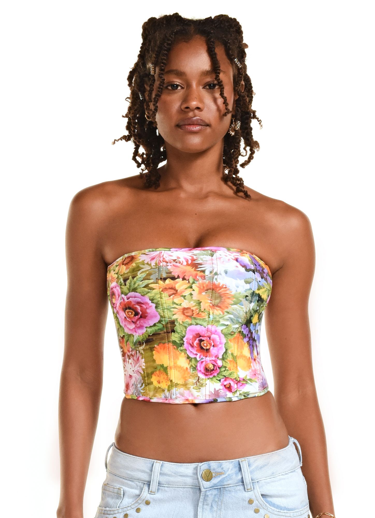 Corset top with a fitted design, provides support with boning and a braided tie detail at the back. Digitally printed microfiber fabric. REF.: V26BL01EA Composition: 84% Polyamide 16% Elastane + Lining UV Protection Model wears size XS Made in Brazil Pieces are subject to print changes depending on the fabric cut. Gently wash