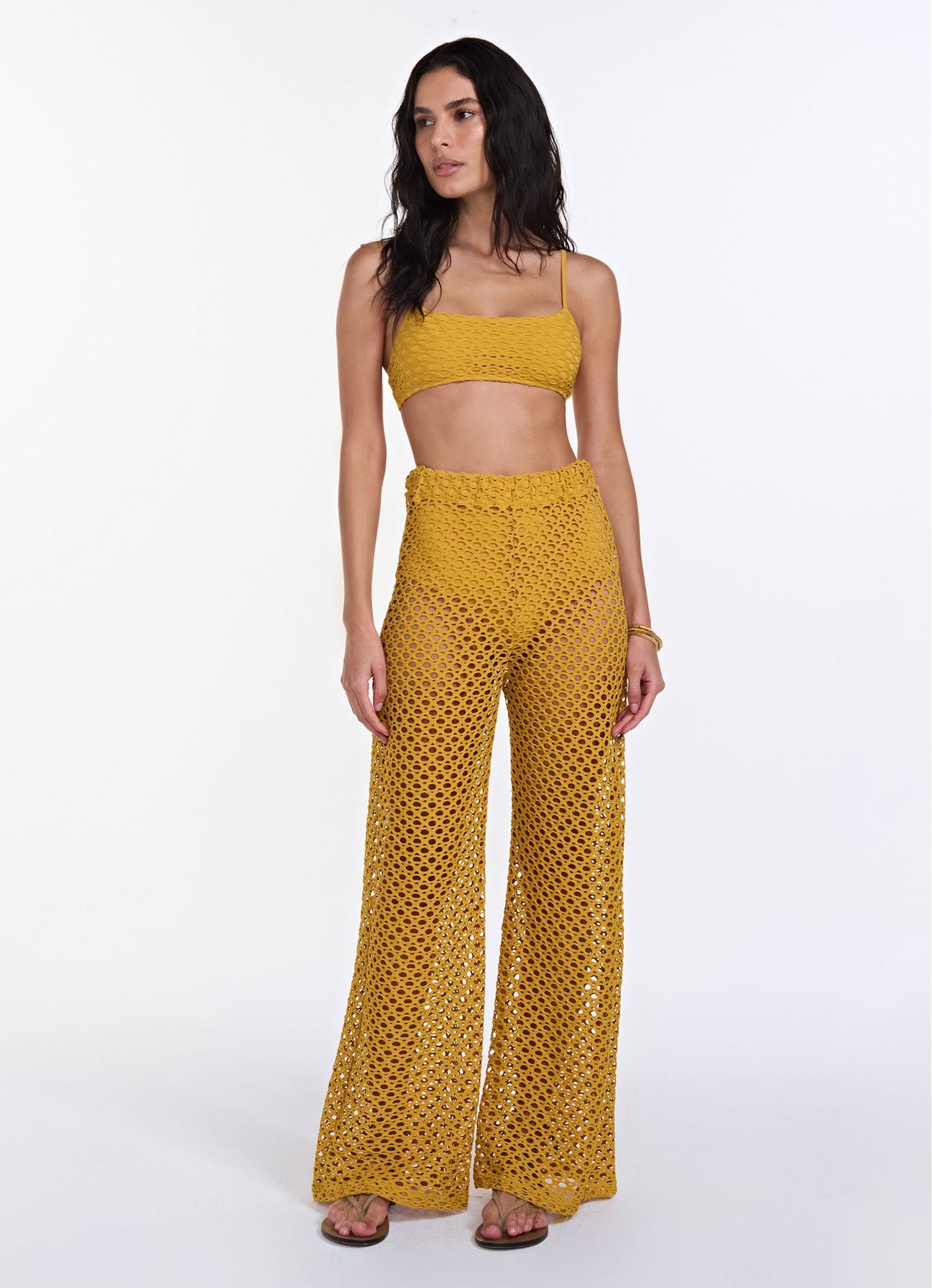 Yellow lace knit pants with elastane and lining, ensuring comfort. The wide-leg style, with a light and flowing drape, provides comfort and elegance. With a high, elasticated waist, the piece offers a comfortable fit to the body and enhances the silhouette. Ideal for wearing over bikinis and swimsuits. REF.: V26CL02LC Composition: 96% Polyamide 4% Elastane Model wears size PP Made in Brazil Wash gently