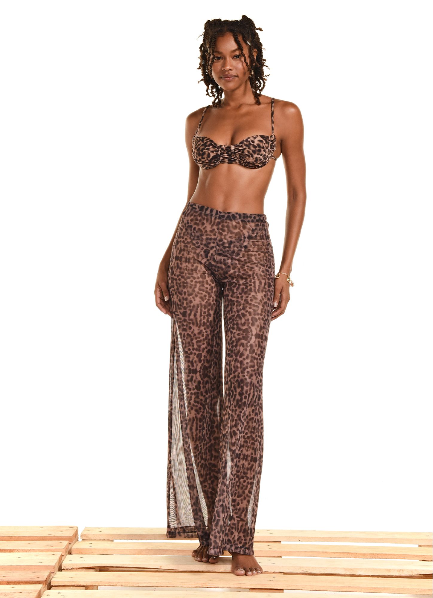 Tulle pants with elastane, made of a lightweight and comfortable fabric with an exclusive animal print from the Summer 2026 collection. Their slight transparency ensures a modern and sophisticated look, perfect for a beach outing. The high waist and elastic waistband offer a secure and comfortable fit. The straight cut elongates the body, providing a fluid and elegant fit. REF.: V26CL01PB Composition: 95.5% Polyester 4.5% Elastane Model wears size XS Made in Brazil The pieces are subject to changes in the print according to the fabric cut. Gently wash.