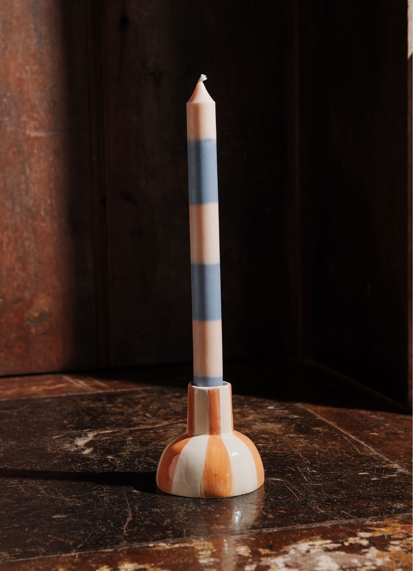 Measurements: 8cm high x 4cm diameter at the opening Material: Hand-molded and painted ceramic. Description: Vintage raw ceramic piece, hand-painted with stripes. Four color options: green, blue, yellow, and nude. Functionality: In certain situations, this is the finishing touch to a table – candlesticks and candles. Made to complement the collection's table setting or to use as an ornament on a shelf or side table, this piece is versatile and full of personality. Note: Each Jay Home piece is handmade with care and dedication at every stage. Because they are handcrafted, small variations in color, shape, and texture are part of the process – and that's precisely what makes each item unique. These differences reflect the organic forms and the individual touch of the creator, giving even more authenticity and personality to each piece. REF.: JAY43