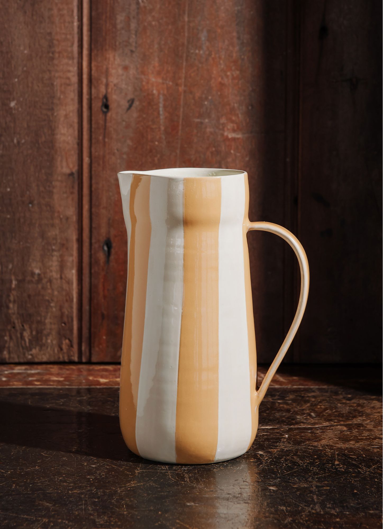 Measurements: 24cm x 10cm (mouth) Volume: 1.65 L (1650 ml) Description: Ceramic pitcher with a vintage raw finish and hand-painted stripes in the collection's green tone. A versatile piece with visual presence. Available in four colors from the collection. Functionality: Can be used both as a decorative piece and as a pitcher to serve larger portions of various beverages. It also works well as a vase or centerpiece, complementing different environments with personality. Note: Each Jay Home piece is handmade with care and dedication at every stage. Because they are handcrafted, small variations in color, shape, and texture are part of the process – and that's precisely what makes each item unique. These differences reflect the organic forms and the individual touch of the creator, giving even more authenticity and personality to each piece. REF.: JAY39