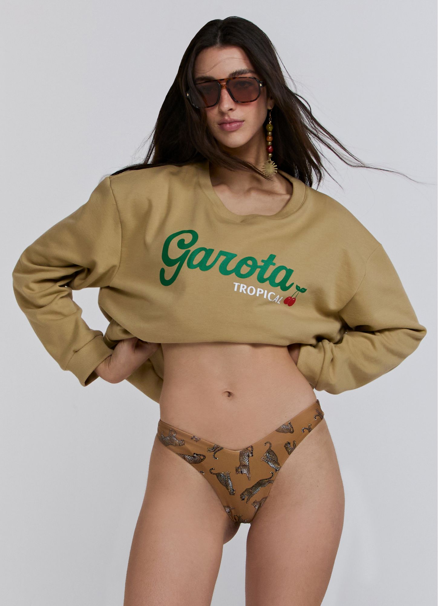 Comfortable, oversized sweatshirt, fully lined, with a slightly cropped fit and ribbed cuffs for a stylish look. The highlight is the phrase "Tropical Girl," which adds personality. REF.: I26BL18AA Composition: 59% Polyester 41% Cotton Model wears size S Made in Brazil