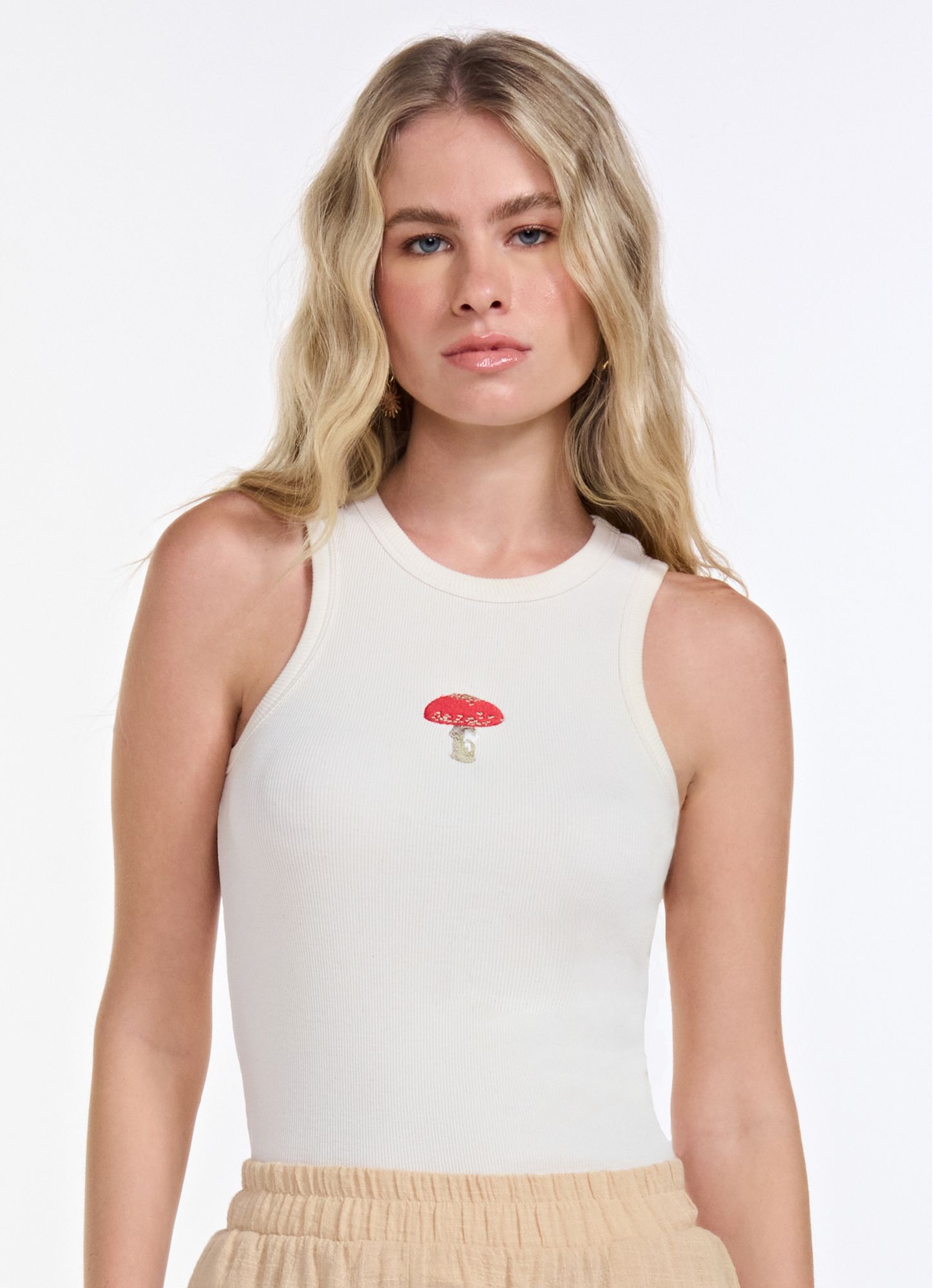 The ribbed tank top is a versatile and timeless piece, featuring exclusive mushroom embroidery, crafted from high-quality ribbed knit fabric, and a classic crew neckline and a fitted fit. REF.: V26BL02AC Composition: 100% Cotton Model pictured in size XS Made in Brazil Gentle wash