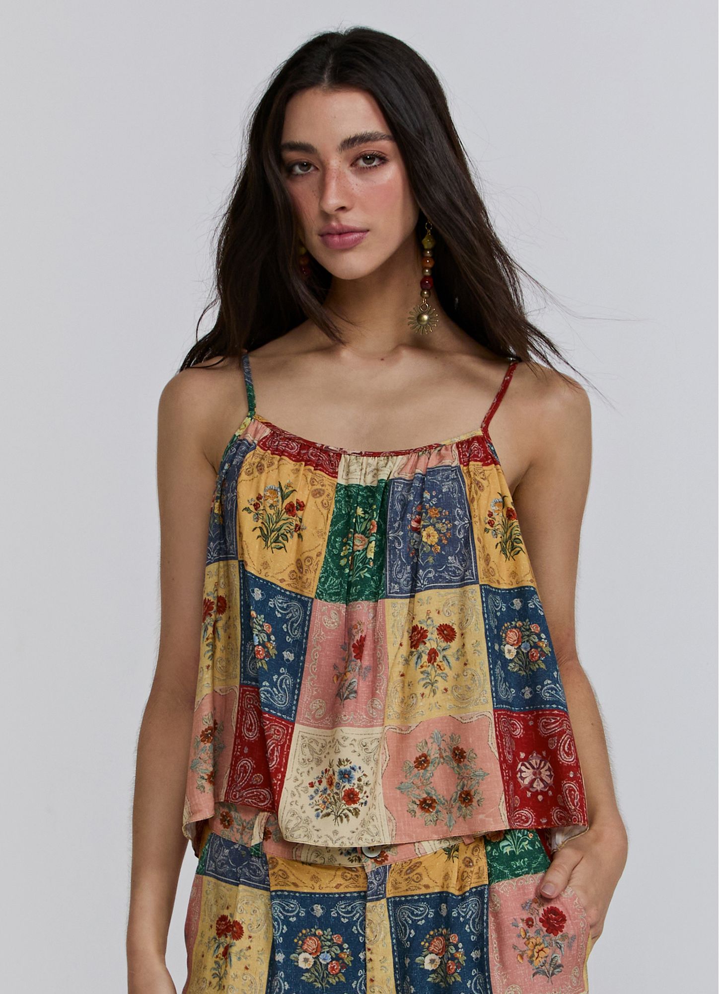 The Winter26 exclusive digital viscose print tank top features a loose and flowing fit, providing movement and comfort when worn. The thin straps and delicate neckline flatter the décolletage, while the floral patchwork print brings a sophisticated and timeless look. REF.: I26RG04VA Composition: 100% Viscose Model wears size S Made in Brazil Prints may vary slightly depending on fabric cutting.