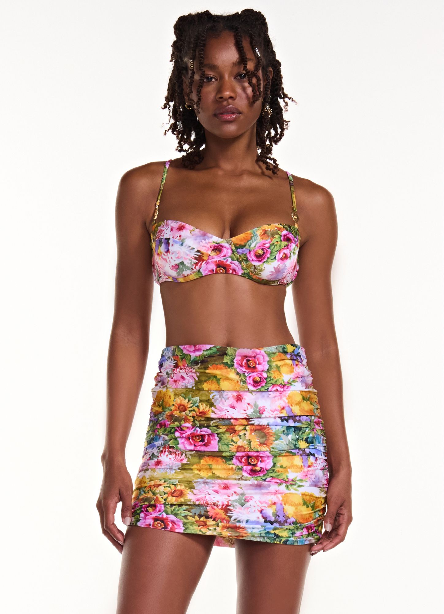 Short, high-waisted, Brazilian watercolor-print skirt with side draping. Microfiber fabric with digital print. REF.: V26SA02EA Composition: 84% Polyamide 16% Elastane + Lining UV Protection Model wears size XS Made in Brazil Pieces are subject to print changes depending on the fabric cut.