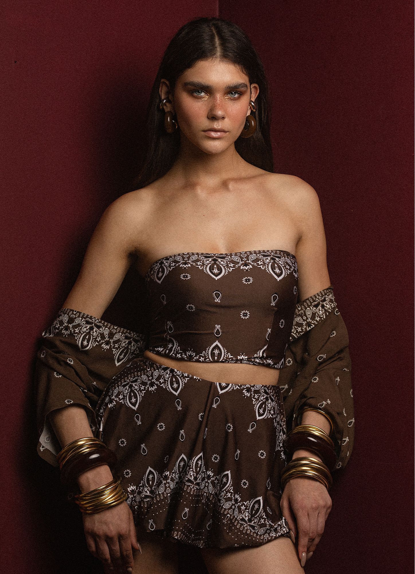 Exclusive digital print top from Bandana Winter 2026 with 50+ UV protection. This strapless top elegantly accentuates the neckline. The structured design ensures support and comfort. Versatile and timeless, it's ideal for beachwear and urban looks. REF.: I26T30EA Composition: 84% Polyamide 16% Elastane + Lining UV Protection Size PP in photo Made in Brazil Wash gently