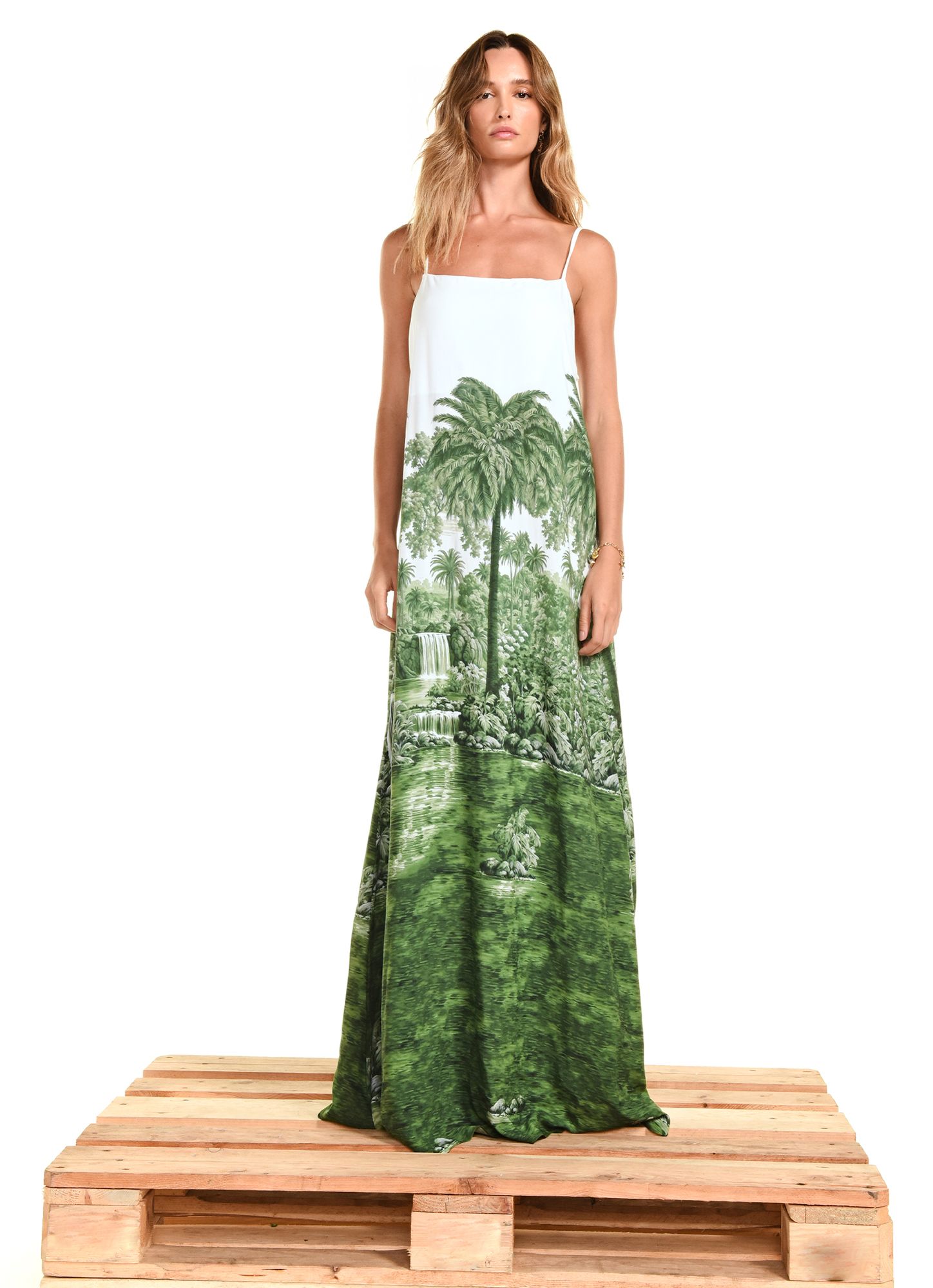 Dress with a localized print, long length, straight neckline, and thin adjustable straps. Exclusive digital print fabric. REF.: V26VE06VA Composition: 100% Viscose Model wears size S Made in Brazil Gentle wash