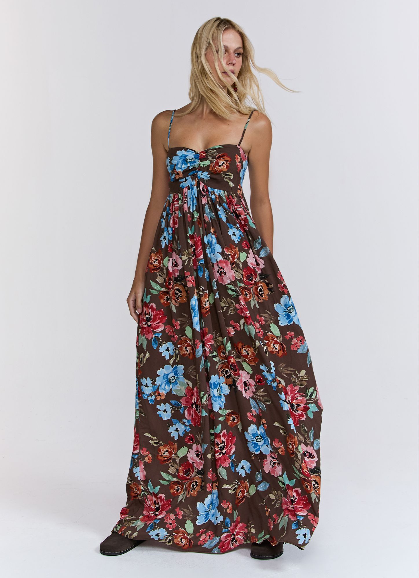 Dress with exclusive digital floral viscose print, Winter 26 collection, long length made of lightweight and flowing fabric, bust with ruching to enhance the neckline, the length develops with a fluid drape, creating an elegant and elongated look, back with elastic detail for a better fit, ideal for outfits that transition between beach and urban looks. REF.: I26VE01VA0 Composition: 100% Viscose Model wears size PP Made in Brazil Prints may vary slightly depending on fabric cutting Wash gently